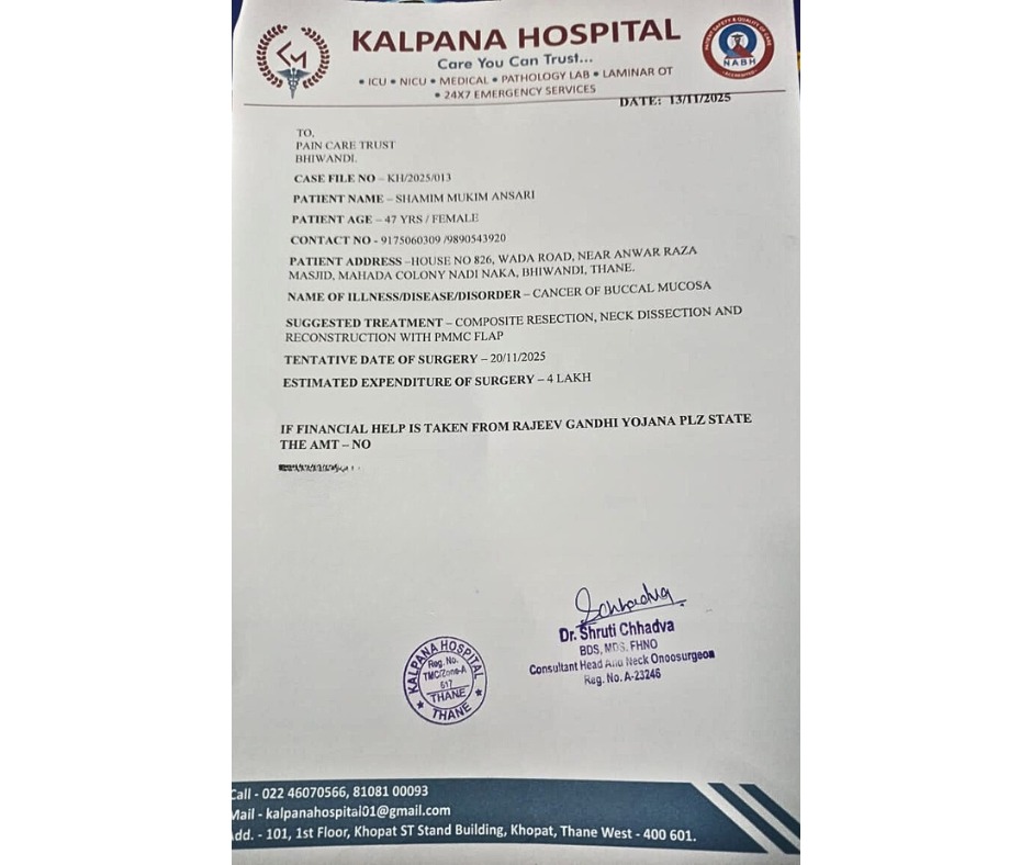 One month ago, my life changed completely when I was diagnosed with Buccal Mucosa Cancer. My treatment started immediately, and I am now undergoing immunotherapy. The estimated cost is 3 to 4 lakh, and PainCare Trust is helping by fundraising ₹𝟏,𝟎𝟎,𝟎𝟎𝟎.