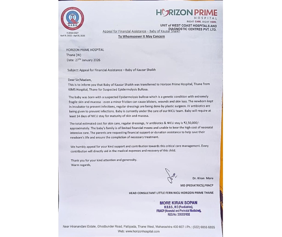 My 10-day-old baby has been 𝐝𝐢𝐚𝐠𝐧𝐨𝐬𝐞𝐝 𝐰𝐢𝐭𝐡 𝐄𝐩𝐢𝐝𝐞𝐫𝐦𝐨𝐥𝐲𝐬𝐢𝐬 𝐁𝐮𝐥𝐥𝐨𝐬𝐚 and requires 𝟏𝟒 𝐝𝐚𝐲𝐬 𝐨𝐟 𝐍𝐈𝐂𝐔 𝐜𝐚𝐫𝐞. The estimated cost of treatment is ₹2,50,000, out of which ₹𝟗𝟎,𝟎𝟎𝟎 𝐢𝐬 𝐬𝐭𝐢𝐥𝐥 𝐫𝐞𝐦𝐚𝐢𝐧𝐢𝐧𝐠, which is beyond my financial capacity. I humbly request your kind support to help save my child’s life. I will be forever grateful for your help during this difficult time.