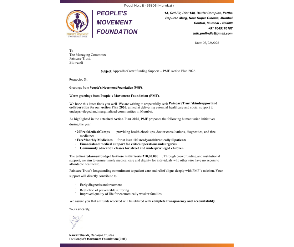 People Movement Foundation (PMF) seeks support from Pain Care Trust to deliver essential healthcare to underprivileged and marginalized communities.