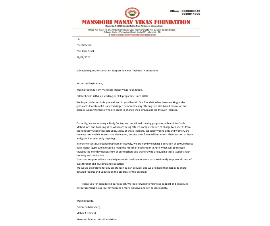 Mansoori Manav Vikas Foundation has been working since 2014 to uplift underprivileged communities. Through our free Study Centre and vocational training in Beautician Skills, Mehndi Art, and Tailoring, we empower young girls and women from economically weaker backgrounds.