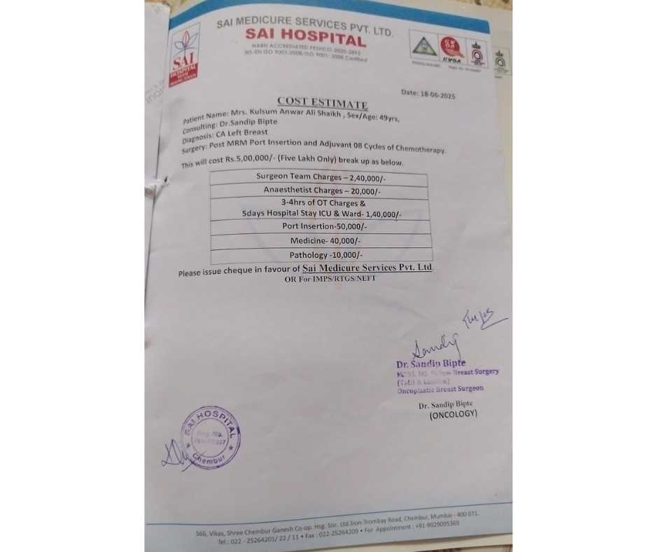 My name is Kulsum Anwarali Shaikh. I have been diagnosed with breast cancer and require urgent surgery and treatment costing around ₹5,00,000, which I am unable to afford.