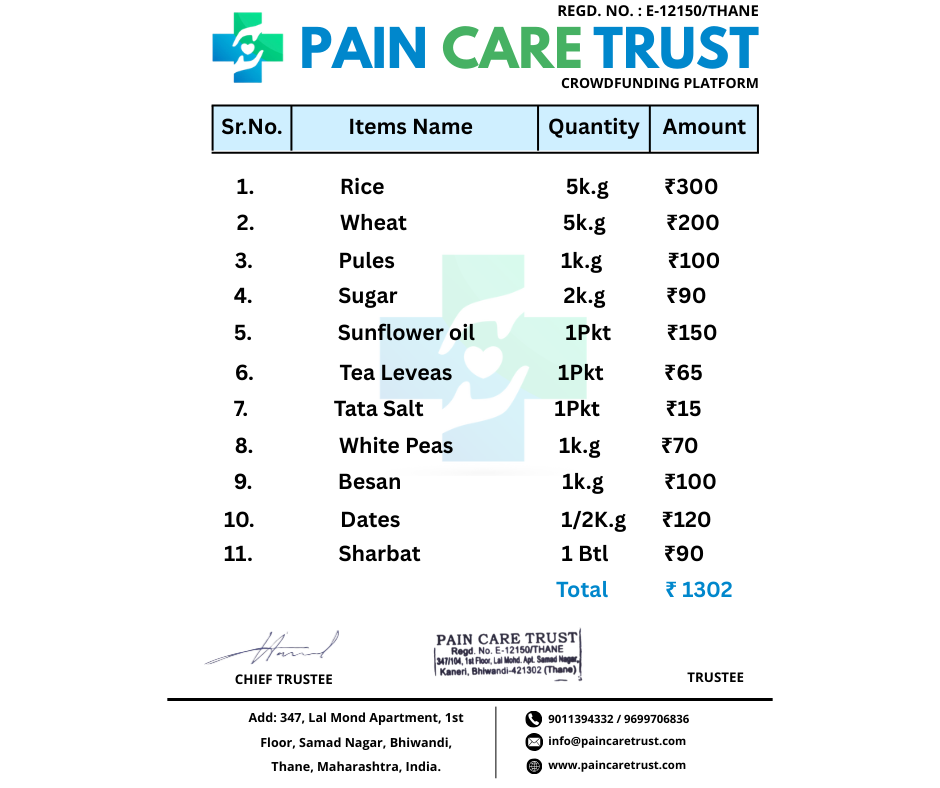 PainCare Trust is supporting families in need by distributing ration kits during this holy month. Our goal is to raise โน5,00,000, through which we aim to distribute 416 ration kits, ensuring families can observe Ramadan with dignity and peace.