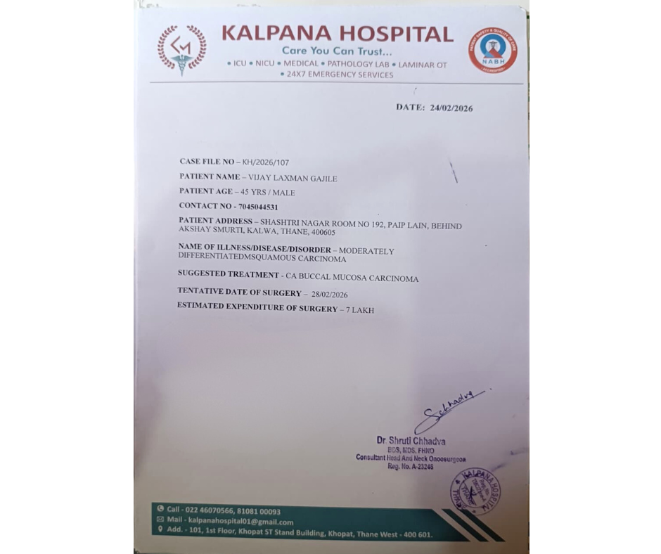 My name is Vijay Laxman Gajile, and I am 45 years old. Recently, I was diagnosed with mouth cancer, and my treatment started just one month ago. This sudden illness has brought a heavy emotional and financial burden on my family.